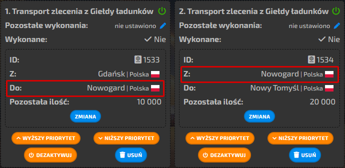 Zadań możemy przypisać nieograniczoną ilość, co daje nam możliwość zaplanowania trasy na cały dzień, a nawet kilka dni. Dla przykładu na zdjęciu są dwa zlecenia, gdzie drugie startuje w miejscowości w której zakończy się zlecenie pierwsze, by zmaksymalizować zyski i nie robić pustych przejazdów.