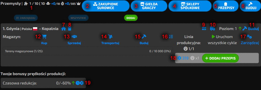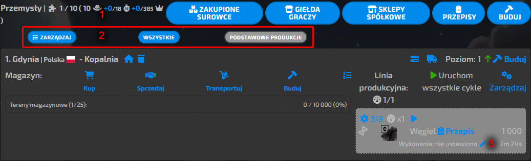 Zanim wybudujemy pierwsze przedsiębiorstwo warto się zastanowić jaka branża nas interesuje i co finalnie chcemy produkować. Jest to chyba największy problem każdego nowego gracza. Często pierwszy wybór nie jest tym dobrym więc mamy możliwość burzenia, a przy większych problemach zresetowania całego konta by zacząć jeszcze raz. Jednak aby nie zrazić się od samego początku dla całkowicie nowych graczy proponuję zacząć od kopalni, ponieważ jest ona fundamentem bardzo wielu produktów w późniejszym etapie gry.