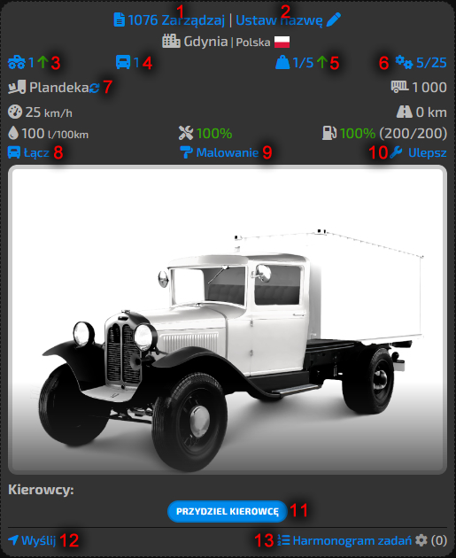 Daje nam możliwość automatyzacji transportu. Aby go ustawić należy wejść w “Auta”, następnie przy samochodzie “Harmonogram zadań” (Pkt. 13 na zdjęciu powyżej). Na górze znajduje się przycisk “Dodaj zadanie”, wtedy pokażą nam się wszystkie możliwości czyli obsługa zadań ze spółki, kupno, sprzedaż, przejazd samochodu itd. Wybieramy interesującą nas kategorie i dodajemy.